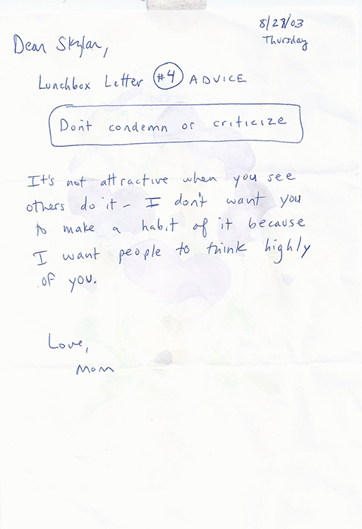 One day in 2003, when I was in 6th grade, my mom put a letter in my lunchbox with some advice on it. “Don’t be quick to judge the girls at school — it’s up to you to look for something good in each one.”